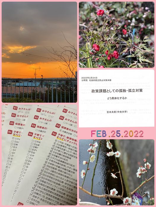 2月25日(金)昨日、開催された公明党社会的孤立防止対策本部の「政策課題としての孤独・孤立対策」のオンライン講演に参加し、課題等を勉強させていただきました。今日は午前中、市民相談や調べもの。午後からは、公明党アンケートのご協力をお願いしていたところへ回収にまわり、いろんな色の梅を観賞しながら歩きました(^^)✨週末は少し寒さも和らぐそうで😊春ももうすぐですね🌸