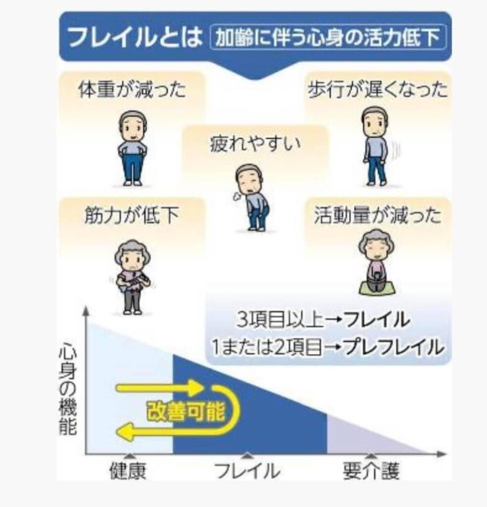 本日の公明新聞よりフレイル予防に取り組もう‼️フレイルとは「加齢に伴う心身の活力の低下」を意味し、健康と要介護の間の状態を指します。基準となる5項目のうち、3項目に該当するとフレイル、1~2項目でプレフレイルになります【図参照】。しかし、日常での心掛けや工夫でフレイルを予防し、健康な状態を保ち、健康寿命を延ばすことは可能です。