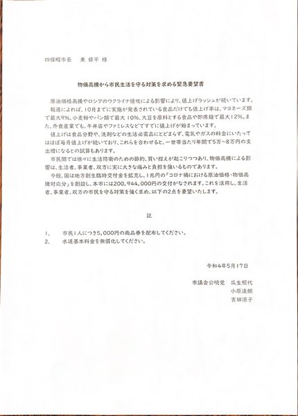5月17日(火)本日、公明党市議団として東修平市長へ『物価高騰から市民生活を守る対策を求める緊急要望書』を提出。物価の高騰やロシアのウクライナ侵略による影響により食料品や日用品など様々な物が値上げされ、生活に大きな影響が出ています。市民を守る対策を強く求め、1、市民1人につき5,000円の商品券の配布2、水道基本料金の無償化の2項目について要望いたしました。