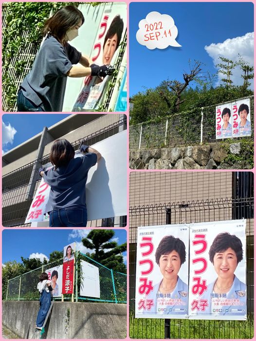 9月11日(日)今日は、新しい「うつみ久子」ポスターの貼り替えに✨真夏のような日差しの中、汗だくになりながら今日は、娘も率先して手伝ってくれました(^^)途中、壮年の方からお声を掛けていただき、応援しますとの力強いお言葉をいただきました❣️いつも快くポスターを貼付させていただき、ありがとうございます😊