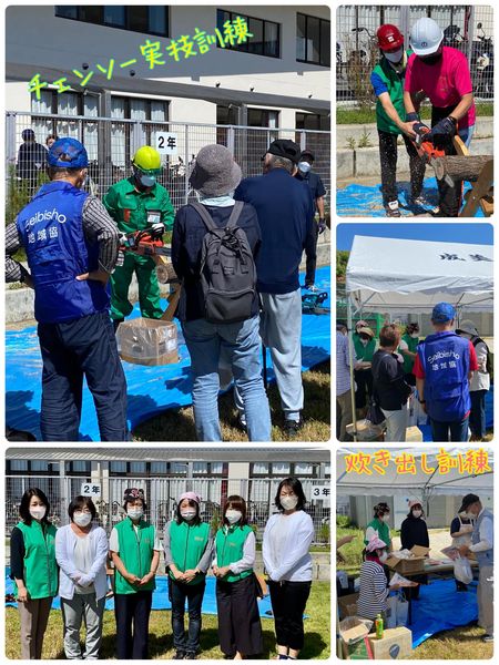 成美小学校のグランドでは、㈱マキタさん・赤十字奉仕団の皆さんのご協力のもと、資機材(チェンソー)の取扱講習や炊き出し訓練が行われ、多くの皆さまが参加されました。