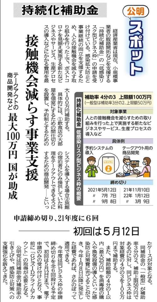 (公明スポット)持続化補助金/接触機会減らす事業支援/テークアウトの商品開発など最大100万円国が助成