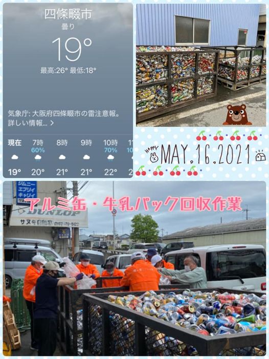 今日は、第3日曜日恒例のボランティアグループ「四條畷を美しくする会」のアルミ缶・牛乳パックの回収作業のお手伝いに。雨の予報でしたが、作業中は雨が降ることなく、無事に終了。お疲れ様でした(^^)/