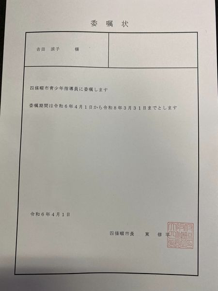 4月24日(水)今日は、令和6年度 #四條畷市 #青少年指導員 委嘱状交付式が市役所東別館にて行われました。今年度より、青少年指導員のメンバーとなり本日、委嘱状をいただきました。緊張して出席しましたが、知り合いの方もたくさんおられ安心しました^ – ^❣️今年度青少年指導員は56名。皆さまと共に、お役に立てるしっかりがんばります‼️