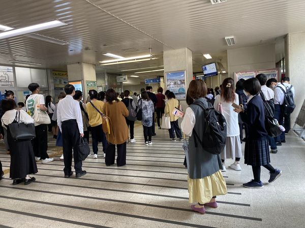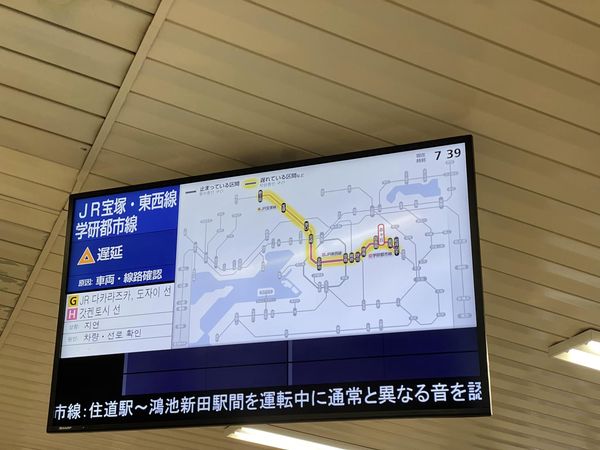 電車の #遅延 が発生しており駅は人で溢れておりました。通常と異なる音が確認されたことが原因のようですが、少しずつ動き始めますとのアナウンスが流れています。