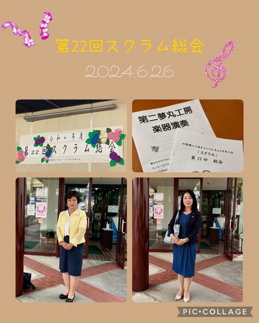 6月26日(水)今日は、総合センターで開催された四條畷心の病を持つ人を支える市民の会「スクラム」の第22回総会へうつみ久子府議と共に出席させていただきました。第二部では、第二夢丸工房、当事者の楽器演奏🎶これまで練習してこられた #カントリーロード、#糸、#愛は勝つ の演奏を皆さまと一緒に楽しませていただきました😊✨♬