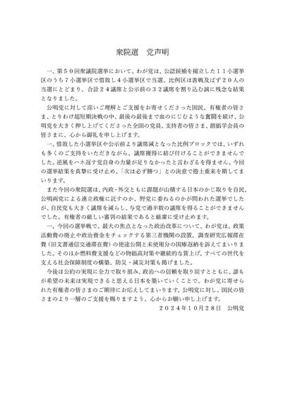 10月28日(月)この度の衆院選、大変厳しい大激戦となりました。最後の最後まで真心のご支援をいただいた皆さまに心から感謝と御礼を申し上げます。結果は大変厳しいものとなりました。今回の結果を真摯に受け止め、「大衆とともに」との立党精神のまま、希望の未来の実現に向かって決意新たにがんばってまいります。この度は本当にありがとうございました。