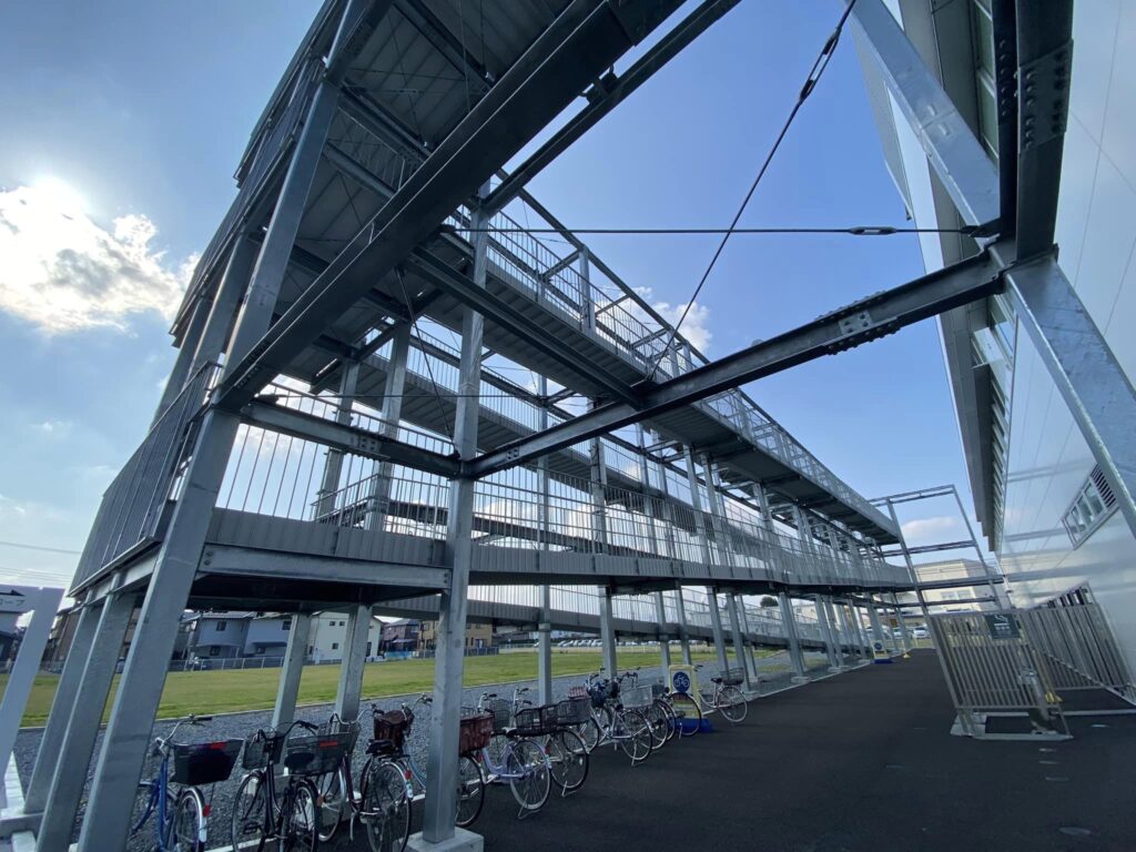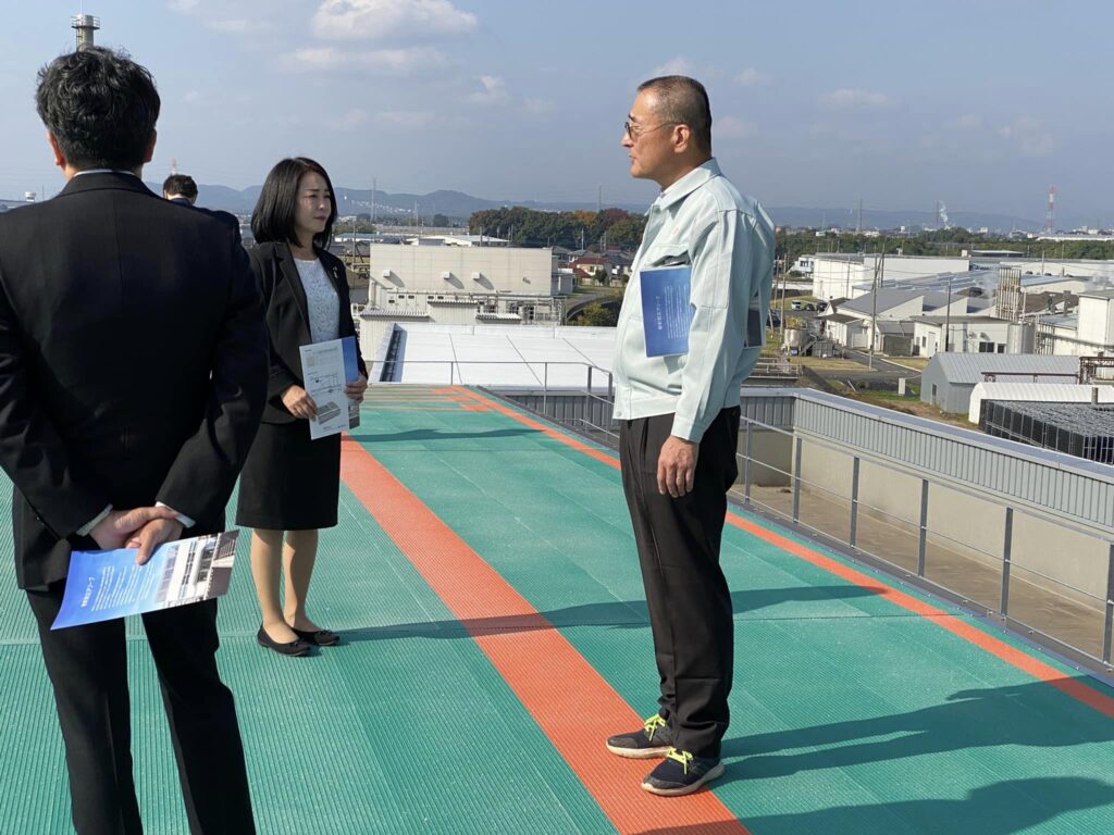 屋上にはヘリポートや、下水道に直結できる組み立て式のマンホールトイレに加えラップポントイレも導入。最大の特徴は、体育館の外に設置されている屋上への避難スロープ。かなりの高さにドキドキしながら登りました。