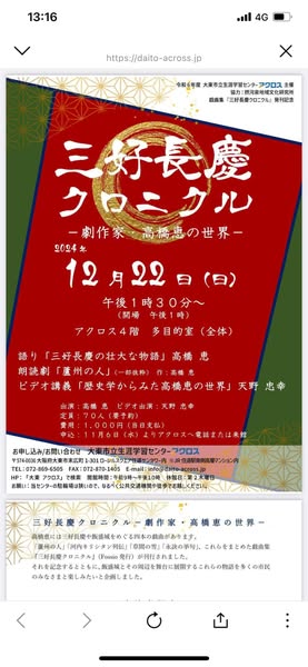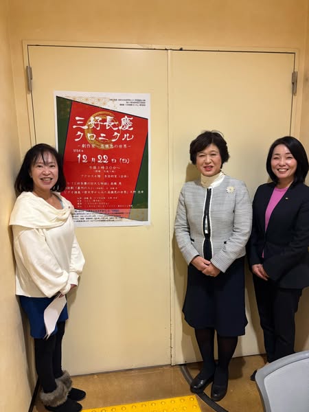 昨日は、お誘いいただき #三好長慶 クロニクル〜劇作家 #高橋恵 の世界〜へ。劇作家の #髙橋恵 さんが、#三好長慶 をテ-マに戯曲の本の発刊記念として開催。天野忠幸教授のビデオ講義や三好長慶の歴史など迫力の朗読劇を堪能。今日は、市役所にて市民相談。東別館入り口には、見事な生け花が✨新しくりんご通信Vol.12を作成中。完成後、ご挨拶にお伺いいたします😊🤚