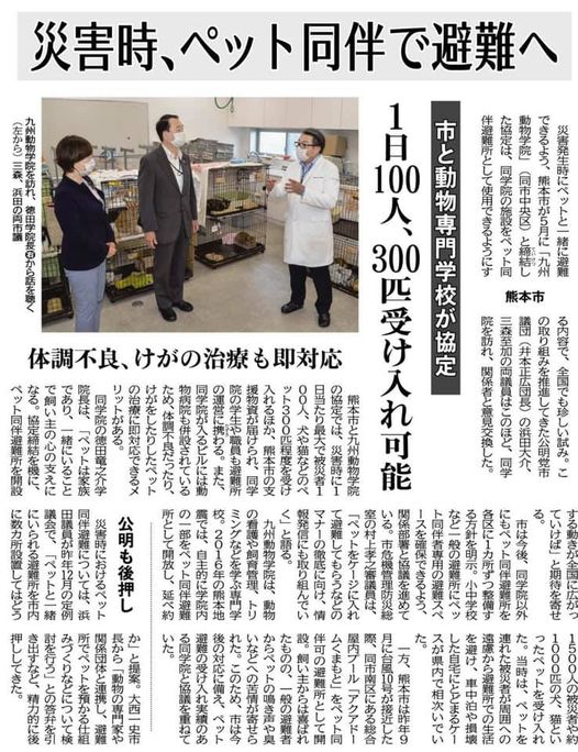 災害時、ペット同伴で避難へ/市と動物専門学校が協定し1日100人、300匹受け入れ可能/熊本市