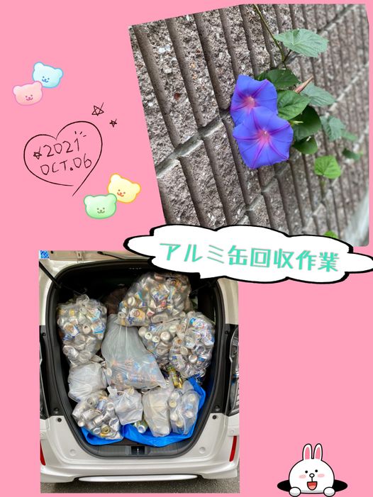 今日は、アルミ缶の回収に。約2週間で車いっぱいのアルミ缶。提供してくださる方とお話しするのが楽しみで😊いつもたくさん提供していただき感謝です❤️ありがとうございました(^-^)❣️ご近所で見つけた立派なアサガオ。最近よく見かけます🙂市役所の周りにも今もなお、まっさかりといった感じで咲いていました🤗夏の朝顔より咲いている時間が長いそうです(^^)❣️