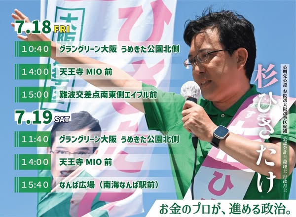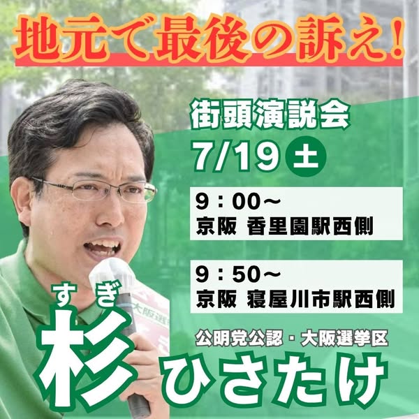 みなさん、こんばんは✨選挙戦も最終盤となりました!!街頭演説会で、杉ひさたけのお訴えをさせていただきます。19日(土)は、杉ひさたけの地元 寝屋川市からスタート▶️最後の最後まで、全力で走り抜きます!!どうか街頭演説会にお越しください✨