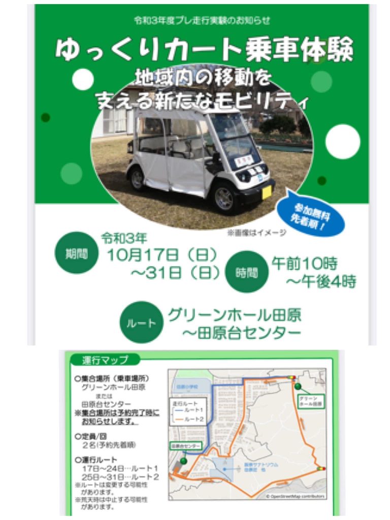 四條畷市では、10月17日から31日まで東部地域のプレ走行実験「ゆっくりカート乗車体験」が行われています。本日、公明党市議団3人で乗車させていただきました🚙名前の通りゆっくり安全に走行し、田原の景色を眺めながら、グリーンホール田原からアカカベ店へ向けて試乗。今日は風が強かったので、帰り道は車のカバーをおろしてもらって走行。思った以上に風をしのげて快適でした♪予約制となっていますが、是非、一度試乗してみて下さい😊