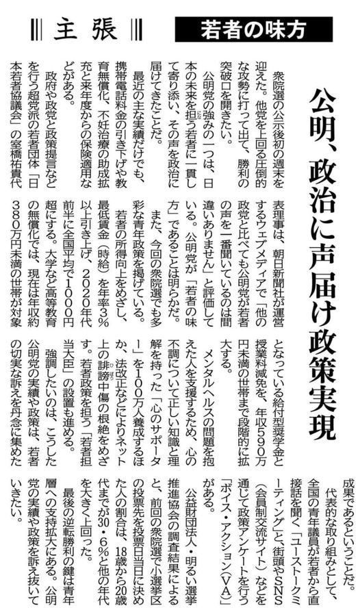 (主張)若者の味方/公明、政治に声届け政策実現‼️