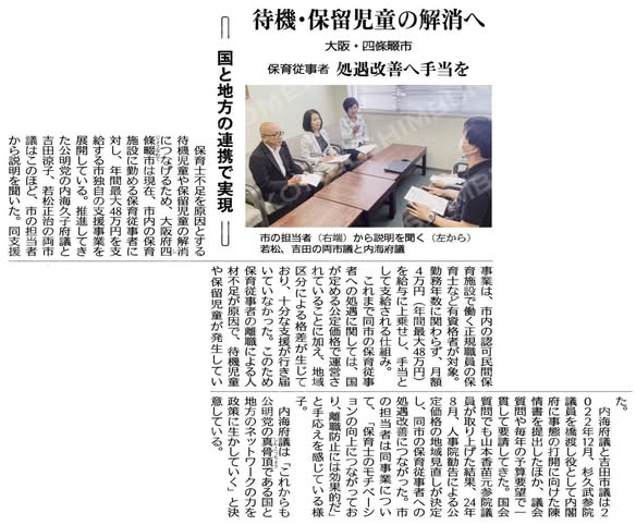 四條畷市 では、待機・保留児童の解消へ向けた支援策として保育従事者への処遇改善の取り組みを今年度よりスタート。