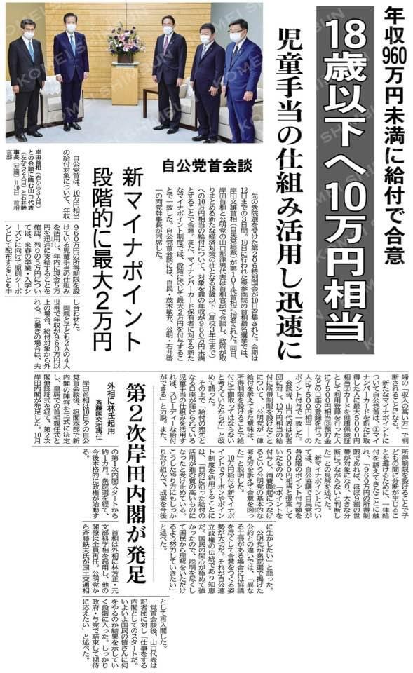 (年収960万円未満に給付で合意)18歳以下へ10万円相当/児童手当の仕組み活用し迅速に/自公党首が会談