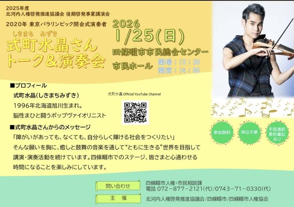 今日は、市民総合センターにて2025北河内人権啓発推進協議会後期啓発事業として #式町水晶 さんのトーク&演奏会が開催されました✨