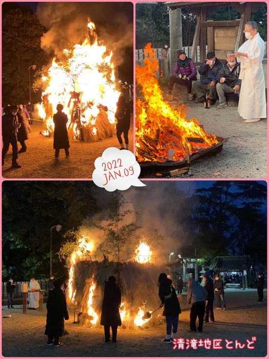 1月9日(日)おはようございます😊今朝は、清滝地区のとんど行事へ参加させていただきました。昨年はコロナで中止となりましたが、今年は開催され今年も恒例の年男、年女の皆さんにて6:30に点火🔥お神酒、ぜんざいもご用意してくださり、感染対策をしっかり行い振る舞われました。昨日から事前準備をしていただき、役員の皆さま、お疲れ様でした!また寒い中、ありがとうございました🙇♀️