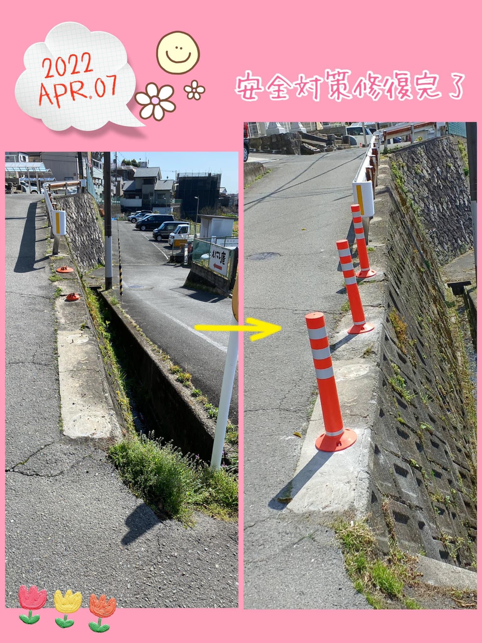 4月7日(木)今日もポカポカ陽気の1日となりました(^^)☀️先日、南野の住吉平田神社下の安全対策用のポールが全てなくなってるとのご相談が。早速、建設課へ。昨日、新しいポールが設置されているとのご連絡…