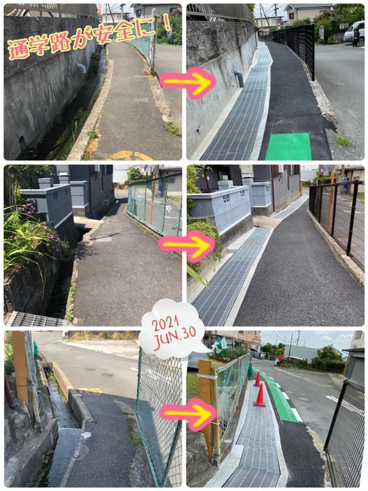 「あの用水路に子供の頃、落ちたことがある」と、お友達のご主人や地域の方などたくさんの方からのお声が。何十年も前から危険とさせれていた通学路。私もこの道を通って小学校へ通っていました。落ちた記憶はないの…