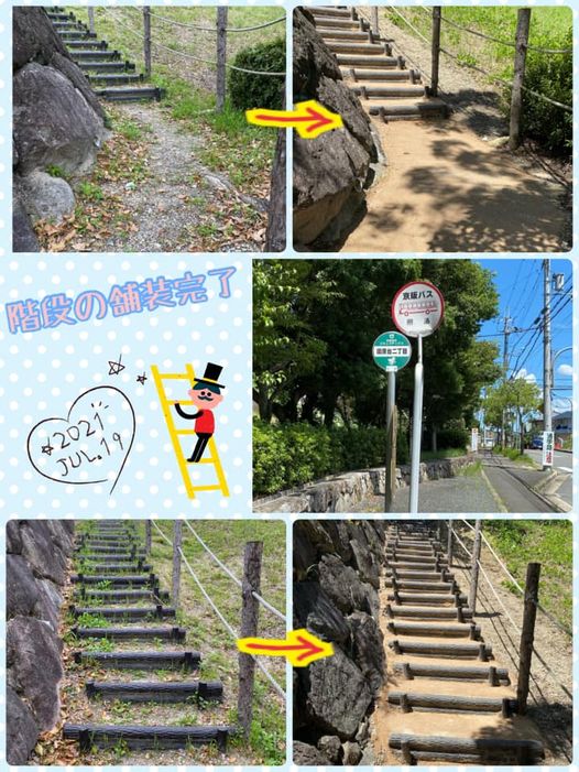 田原台6号緑地にある田原台2丁目のバス停への階段。雨の日はぬかるんで危ないとのお声いただき、担当課へ。先週、固まるまで少し通行止めとしているが、月曜日には通行できるようになります❗️とのご連絡をいただ…