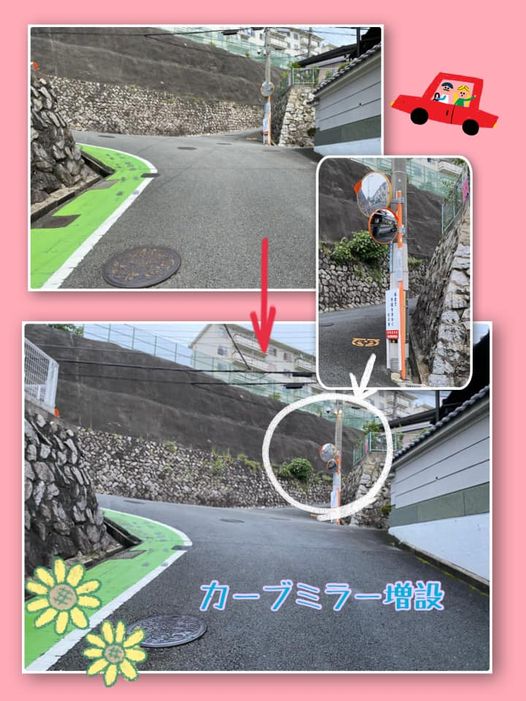 清滝中町から府営清滝団地に上がる三叉路。右手前の道が見えなくて危険とのご相談が。色々対策を検討していただき、カーブミラーを増設していただきました。ご相談者からとても見やすくなったと喜んでいただきました…