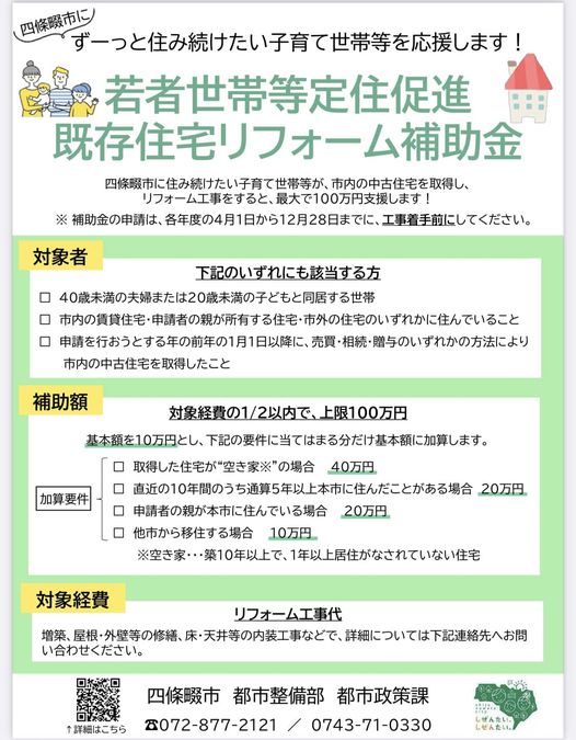 こんばんは✨ よしだ涼子 です。 昨年、委員会や一般質問でも取り上げてきた空き家を活用したリフォーム工事の支援がいよいよ始まりました✨四條畷市では、「若者世帯等定住促進既存住宅リフォーム補助金」が今年…